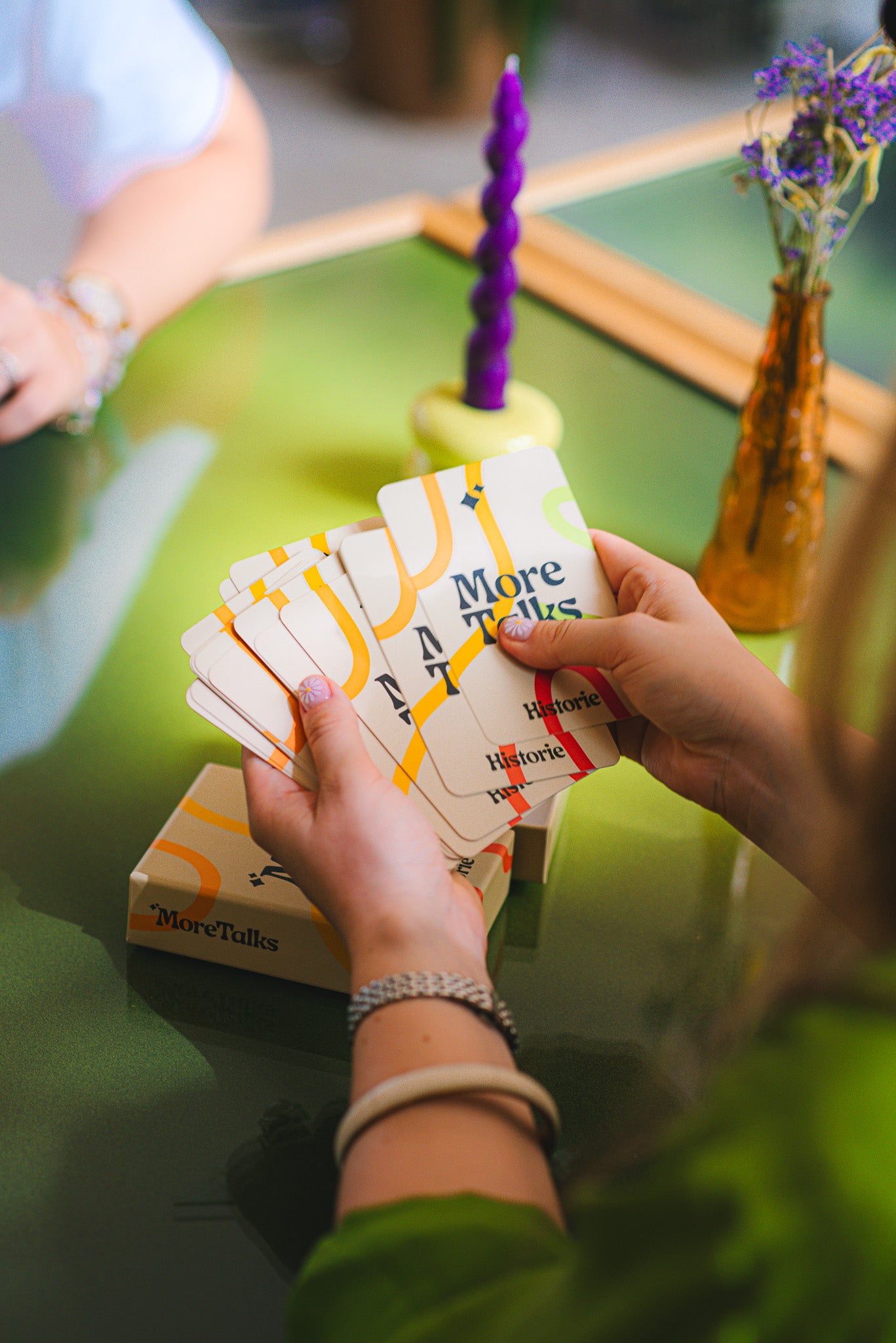 Pracujemy nad każdym zestawem tak, jakby był tworzony dla naszych własnych bliskich. Testujemy, poprawiamy, zmieniamy i dopracowujemy formę, ton i estetykę, aby produkty MoreTalks były nie tylko piękne, ale przede wszystkim wartościowe. Wierzymy, że design ma znaczenie — pomaga otwierać się na rozmowę, tworzyć atmosferę i budować moment, który zapada w pamięć.