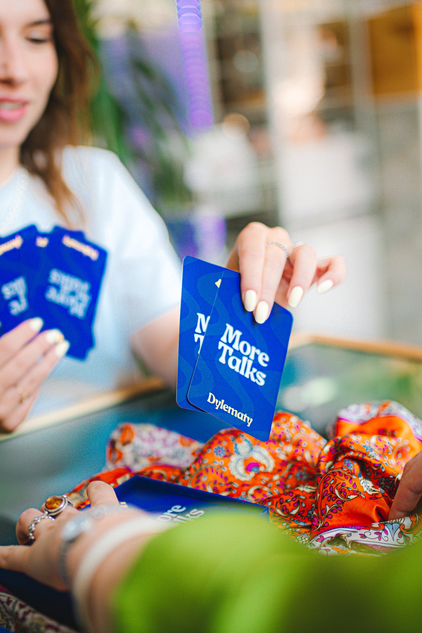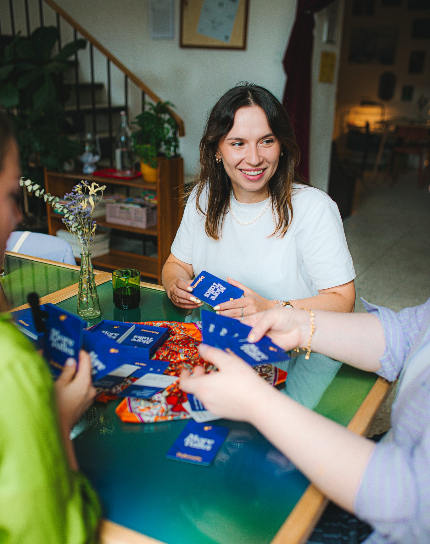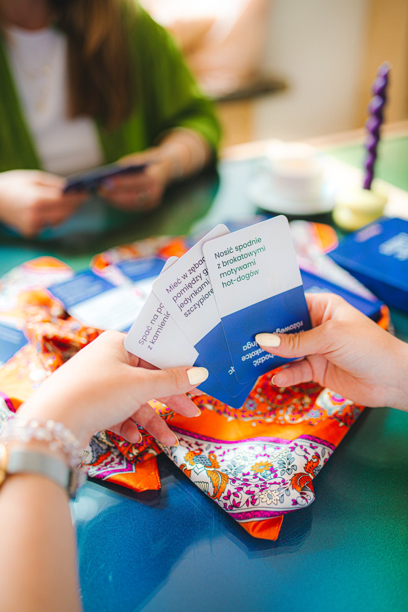 - Karty Dylematy — zestaw prowokujących, zabawnych i inspirujących pytań, które wprowadzają w temat, rozkręcają atmosferę i skłaniają do szczerych rozmów.